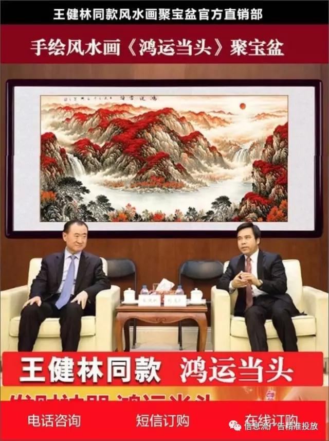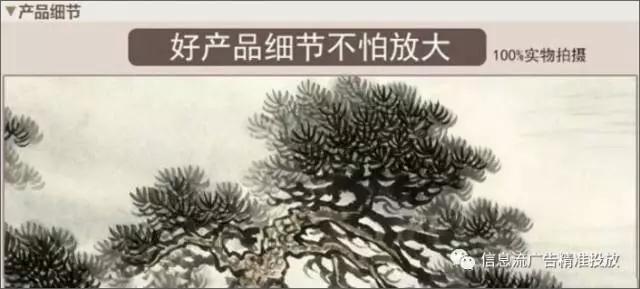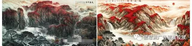 从这位童鞋提供的广告标题,我们提炼出他的广告关键点分别是:客厅/办公室必备→山水画→提升气质→名家精品/收藏。然而当我们打开对应创意的广告落地页第一屏时,我们看到的关键词是:王健林→鸿运→风水画→ 头图用了王健林会议中的图片,背景是本次落地页的主体——山水画。虽然有明确写出了“手绘”字样,但是这幅画给人的直观感受,简化成关键词,就是:印刷品→批量生产→廉价。 那么大家看出问题了么? 简单来说,就是:从广告主说的,到广告实际展示的,再到用户感受到的,完全是三码事。我们都知道,电商类的信息流广告的任务是要引导转化,而引导转化的前提是跟“对的人”说“对的话”。用户本来是奔着“名家精品”、“提升气质”这些关键词来的,可是进来之后看到的却是批量印刷的鸿运当头风水画,被骗的感觉有木有?可能这位童鞋会叫屈:“我们确实是纯手绘的风水画啊!”那么我们来看一下这张对比图: