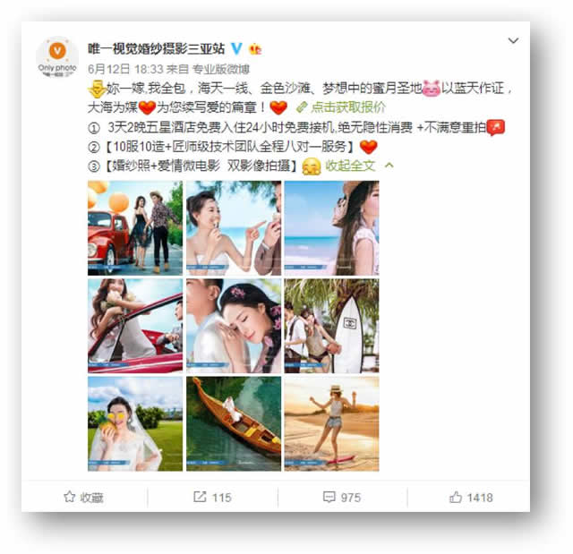 不知道你有没有经常收到这样的广告文案? “你的眉毛做贵了…… “ “欢迎获取2017年婚纱照最新报价…… “ 这样的文案创意,对于摄影和美容等行业来说,经过时间的检验,投放效果经久不衰,我们今天就来一起看看这些网络推广 软文好创意,好文案,我们怎么完美复制! 摄影行业素材分析总结 1、文案 套系优惠类:文案含套系价格及服务内容 引导咨询类:文案简短,一般一两句话,如“拍摄这样的婚纱照多少钱” 链接通常使用金数据、麦客表单 报名引导上,通过链接报名、回复私信报名、回复评论报名等多种形式搭配使用 2、素材要求 图片:客样片主要由客户提供,挑选单一套系或者色调统一的搭配 视频:(1)客样片视频整合播放 (2)拍摄过程视频展示 (3)客人微电影 3、优质案例