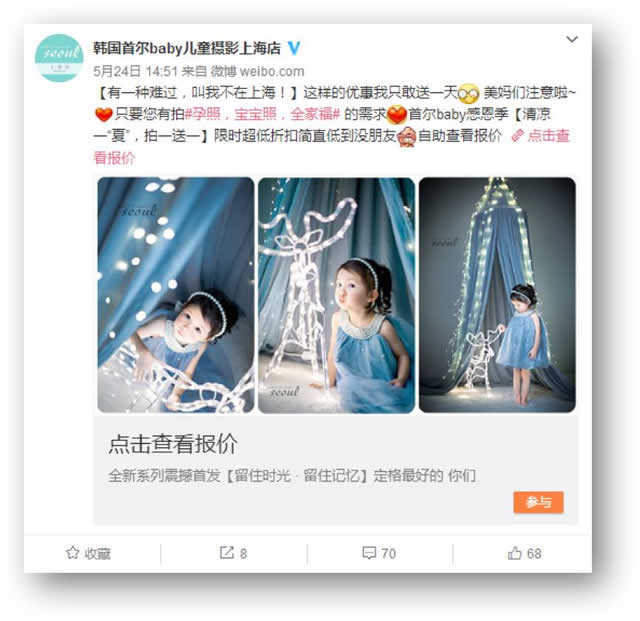 素材方向及文案思路 1、照片以0-2岁宝宝为主,满月照、百天照需求较大效果较好,照片色调统一,展示一个套系或card拼图 2、文案以定时优惠为主,宝妈更注重价格优惠,以折扣优惠为重点吸引,文案内容简单易懂,一目了然,符合宝妈特点。