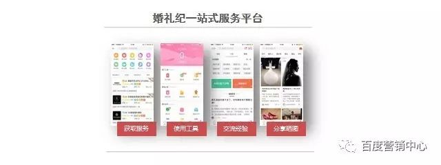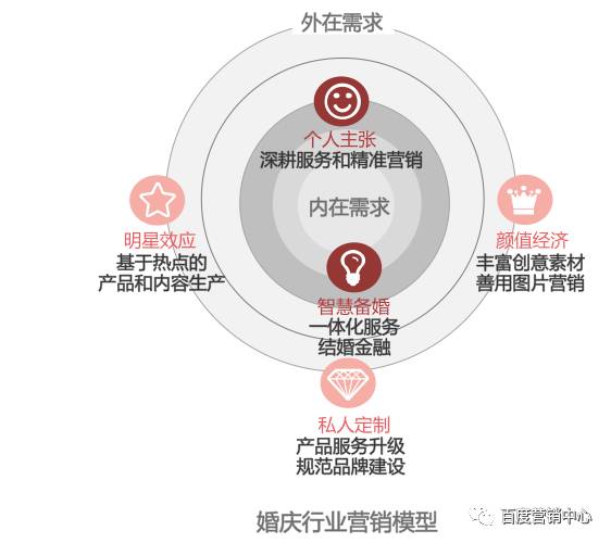 由通用词包触发的百度图片推广,在图片频道置顶展现内容化的搜索结果,唯美展示各类婚纱照,实现用户体验和营销植入的融合。 结语:搭仪式感的桥,造每一个可爱的梦 海明威老师曾教导我们说“假如你有幸年轻时在巴黎生活过,那么你此后一生中不论去到哪里她都与你同在,因为巴黎是一席流动的盛宴。”婚礼作为一场私人盛宴,对于多数人而言是一生美好的回忆,是抵御漫长生活的铠甲。在那场关于婚礼的辩论中,《奇葩说》的一个选手说“婚礼是一种仪式,这种梦幻的仪式可以带来浪漫,婚礼就是爱情的迪士尼。”婚礼是浪漫梦幻的,是充满仪式感的。对于婚庆这门生意,我们对商家的建议可以概括为下面这句话:搭仪式感的桥,造每一个可爱的梦。造梦亦有道,我们总结出以下婚庆行业营销模型,助婚庆商家精准甄别消费者,开启浪漫背后的新商业集点营销推广“算计”。