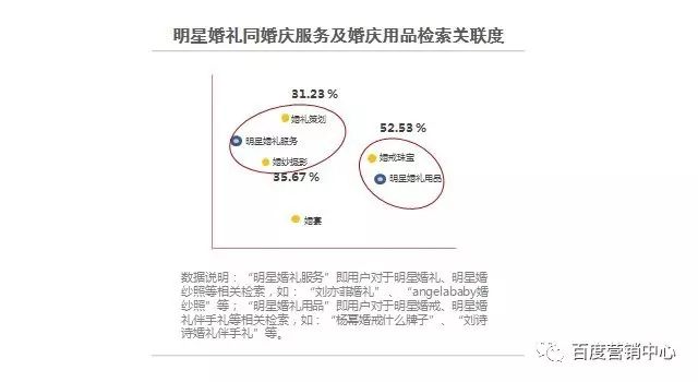 热闹的背后,结婚产业亦在狂欢,关注黄教主婚礼同款的用户,多半自己好事将近。检索过明星婚礼和婚纱照的用户,常常也先后检索过婚礼策划、婚纱摄影等婚庆服务,正在为自己结婚的事出谋划策;检索过明星婚礼用品(多为明星婚戒)的用户中,高达52.53%的用户正在搜寻自己心仪的婚戒品牌或产品,准备迎接人生中的幸福时刻。