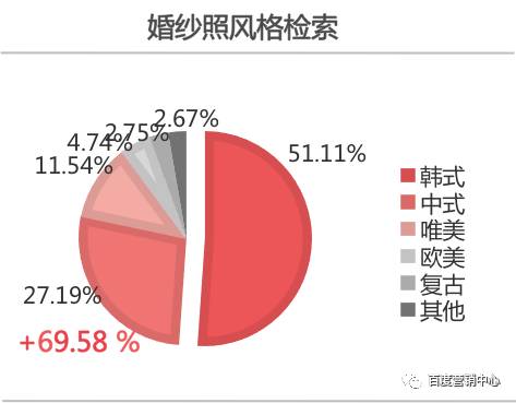 颜值经济:好看即是正义 你长的好看,说什么都对。在这个颜值当道的世界,不管你本身够不够美,做新娘和新郎时都一定要美。在选择婚纱照的时候,消费者读图千张,寻找最美。百度数据统计,消费者在寻找心水婚纱照风格时,最爱韩式、古装和欧美风。我们还发现,wuli中式婚纱照风格关注度同比增长69.58%,哎呦,不错哦。