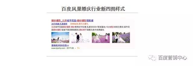 百度凤巢针对婚纱摄影用户的读图看脸需求,整合凤巢和糯米图片物料库,限定首位的四图展现,让消费者看的爽,为商家带来更多的点击量。