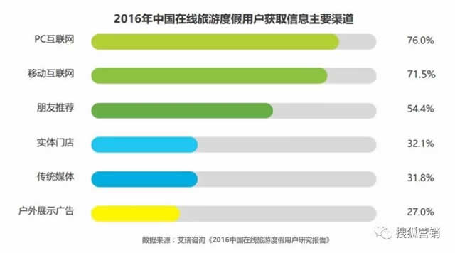 艾瑞咨询的研究报告显示,2016年中国在线旅游度假用户获取旅游网站及度假产品信息的主要渠道为PC互联网(76.0%)、移动互联网(71.5%)和朋友推荐(54.4%)。线下旅游在向线上转移的同时,旅游企业的品牌营销及产品推广也从线下转移到线上。