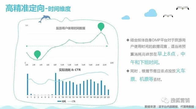高精准定位 提高市场占有率 在广告投放的高精准定位上,搜狐在人群、时间、地域三个维度同时发力,为携程占领更大的旅游市场资源提供先机。 在人群上,通过对数据的分析和洞察,关注旅游的用户同时也是健康美食人群、体育爱好人群、生活娱乐人群、时尚快消人群等。因此搜狐将人群定向设置主攻这四个方向。 在时间上,结合搜狐自身数据管理平台对于旅游用户使用时间的数据调查,调整预算消耗高峰,并根据节假日重点投放火车票、机票等素材。