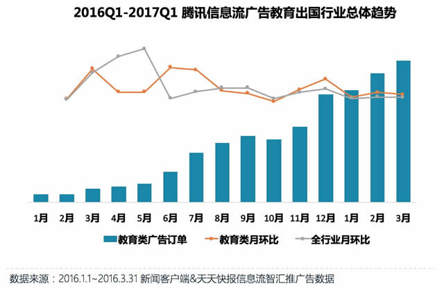 行业概况 教育出国行业相较其他行业,一直处于相对稳定持续的增长状态,在2016年的年中和年末都有一个较大的增幅。从2017年来看,第一季度增势乐观,月环比增长率持续跑赢大盘。