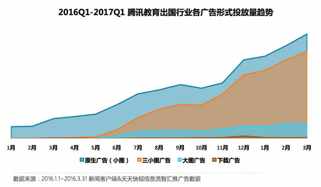 从不同的信息流广告形式来看,教育出国行业以原生广告和三小图广告为主,其中,原生广告投放量位列第一,三小图第二,两者长期保持稳定高速的增长状态,并远高于大图和三小图。