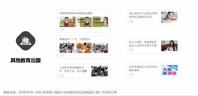 其他教育出国类别中主要集中于成人学习,广告内容涉及成人教育、自考、证书类培训等,该类目综合来看,广告效果良好,拥有巨大潜力。