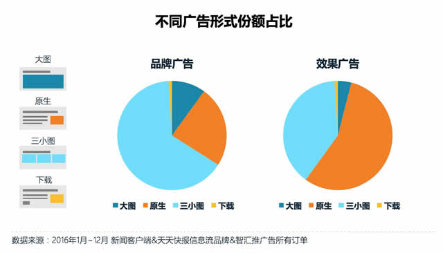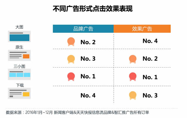 广告效果方面,三小图在品牌和效果广告中点击表现最佳,原生广告表现次之,大图广告在品牌广告中效果较好。