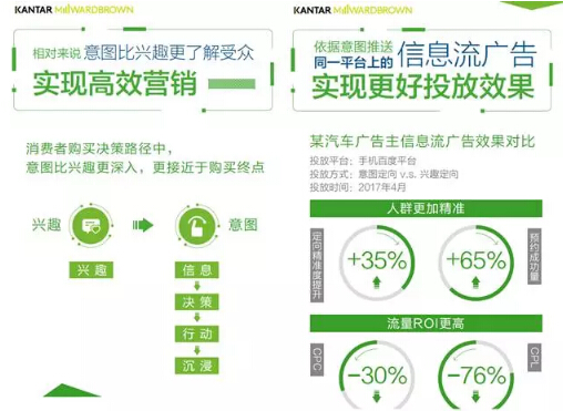 暴风影音和凤凰新闻客户端的信息流广告 追根溯源,众多定向方案从本质上来说可以划归为两类:兴趣定向和意图定向。兴趣定向指的是通过社交或浏览行为判断用户的兴趣偏好,并基于此推送他们感兴趣的内容;意图定向则是借助搜索或购买行为数据,判断用户行为背后的意图,并根据结果为他们适配信息。两种不同的定向方案着眼于人们信息接收过程的不同阶段。兴趣定向偏前端环节,解决的是吸引注意力的问题;意图定向偏后段环节,解决的是记忆乃至实际购买行为。总的来说,前者能够达到不错的覆盖范围,但并不为结果兜底,这刚好与后者相反。所以,摆在CMO桌上的是一个两难抉择:选择覆盖率,抑或是成交结果? 某种程度上,这确实是“蛋生鸡,鸡生蛋”的老调重谈,偏废其中任何一方都无法达到好的传播效果。但值得注意的是,在当前技术快速发展的环境中,互联网巨头的覆盖已经接近饱和,考虑到中国庞大的市场基数,他们能够收集的注意力并非小数。因此,覆盖本身可能并不存在问题。实际上,追求覆盖率本身也沿用的是传统媒体长久形成的思维逻辑。他们追求“高举高打”的玩法,注重声量而非精细化的成本控制。久而久之,这种状况演变成了著名的一问——“丢失的那一半广告费到底去了哪?”与覆盖不同,成交结果的不同依赖于不同公司的数据收集体系和技术理念,这是互联网企业难以通过技术和市场予以弥补的。恰好,追求成交结果本身也契合互联网的发展逻辑。 简单地说,互联网给广告行业带来的最大价值是,解决了此前无法精细量化的问题。通过大数据体系,现在受众的几乎所有行为都可追踪、可寻址、可存储、可分析,这使得企业能够对成本进行严格审视和管控,找回广告支出中“浪费的一半”。以成交结果为导向进行成本分配,其实是一种更为明智的做法,也能实现互联网的优势最大化。 华通明略发布的《信息流广告营销效果研究报告》提到,相对来说,意图比兴趣更深入。它能更了解消费者,最终实现高效营销。