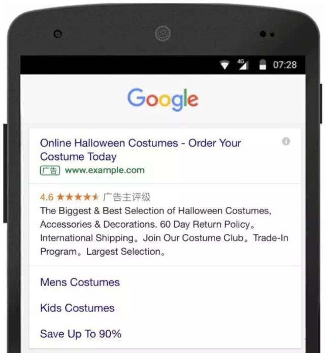 附加信息就是通过在广告中添加更多内容,提高广告的醒目程度,从而增加点击次数。比如很快万圣节就要来了,会有海量用户在线购买万圣节服装,当他们搜索“Halloween Costumes online”关键词时,如上图所示的广告不但有商城网址,附加信息上还有“60天退换、国际直邮、打折优惠”等宣传语,更有男/女儿童等类别的直达链接,怎能不令人心动? 你知道有哪些内容可以成为附加信息吗?这些信息该如何用呢?下面就让小编一一为你介绍吧。 宣传信息、关联商户地址信息 宣传信息就是在广告中添加其他文字,如“免费送货”或“全天候客户支持”等相关信息,吸引顾客实现线上线下转化。附加关联商户地址信息可帮助用户查找附近的销售您产品的商店,以便用户就近购买。