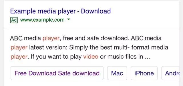 应用信息 如果想推广您的App, 那就选择添加应用信息吧。它可以在全球范围内向使用Android和iOS系统的移动设备用户展示A,吸引他们下载应用。如下图视频播放器的搜索结果直接列出了各个设备适用的下载链接,非常便捷。