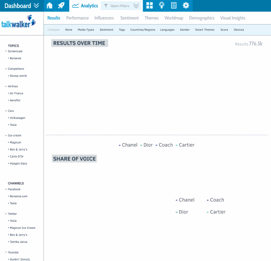 社群聆听是一项重要的技术,并不是每家公司都能掌握。这就是人们使用 Brandwatch公司的原因。该公司不仅帮助众多品牌聆听周围发生的交谈,还就此理解应用,形成自己的优势。 他们有两个产品可供选择:Analytics 和 Vizia。第一个产品提供基础社交报告和社交监控。第二个是全部的社交指挥中心,拥有一些先进的功能,能够在数据以外最大限度的获得信息。 他们网站上有三个计划但是却没有一丁点关于价格的介绍,这多少有点令人迷惑。所以需要访问样本找到比率。 4 TalkWalker公司