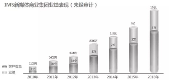 IMS旗下拥有S.M.A.R.T, WIEQ,克劳锐三大体系,分别在社交全案服务、自媒体广告交易平台、自媒体版权等领域进行深度布局,形成了立体化生态体系,具备了全场景社会化营销能力。 在去中心化的新商业生态中,IMS无疑占据了先机,一个个网红和自媒体不是简单的媒体节点,更是未来商业的风暴点。在过去,网红和媒体处于营销的工具序列,现在网红和自媒体却成为社会化营销、电商、内容生态的价值连接点,未来的价值裂变需要在连接点上。IMS成为连接媒体节点和商业世界的重要桥梁,也成为人本化新商业时代的模式探索者,游弋在巨头之间,却创造了新商业生态。 社会化生态的拓荒者 这是一个移动社交为王的时代,微博、微信是移动流量黑洞,人们在移动社交上消费大量时间,而IMS则是连接微博、微信、喜马拉雅、映客等大平台生态的超级代理人,为超级巨头生态建立了有机连接和价值传递,进而产生了超乎传统营销公司的商业模式和市场价值。 从草根大号时代,到自媒体时代,到网红经济,处处都有IMS的身影,汉高集团,New Balance、中粮,平安集团、京东,宝洁,阿里集团等中外知名企业都是IMS的大客户,IMS也在社会化生态爆发中水涨船高,如今已经长成独角兽级别。从小做到大,从国内到全球,社会化营销已经成为主流营销模式,IMS也从拓荒者变成了行业领袖。 其实,IMS新媒体商业集团是一家有全球野心的公司,已经在美国、日本举办了网红大会,汇聚全球网红,交流探索全球网红的发展和商业模式,让中国网红界大开眼界。IMS还推出了Vstar计划,一边造势网红经济生态,一边培育网红产业链的有机生长。 从自媒体生态、网红生态的爆发,到传统媒体的加速衰落,媒体正在加速走向去中心化,李檬的IMS初梦和论断一一被验证,紧接着,将是品牌营销、公关、数字营销、创意营销等大营销生态的自我颠覆和变革。在社会化营销江湖有着超级竞争力,实现了从现象到价值连接、到商业模式创新的生态构建。 下一个“分众传媒”?顺势而为的创变英雄 众所周知,是楼宇广告媒体成就了今天的分众传媒。数据显示,目前分众传媒楼宇视频媒体市场占有率达到95%、楼宇框架媒体市场占有率达70%、影院银幕媒体市场占有率达55%。显而易见,分众传媒赖以生存的渠道是楼宇。 连接一切,连接未来,是互联网公司的使命,无论是互联网上的抽象连接,还是万物互联的硬件连接,我们都将进入一个超级连接的未来世界。在去中心化的世界里,没有节点连接能力,就等于失去了价值连接能力,没有技术和数据驱动,就等于失去了成为巨头的机会。 社会化营销将是未来营销的主流模式,微博信息流广告的高速增长说明了一切,IMS布局社会化营销的全生态链条,正是建立在信息流原生广告的基础之上。