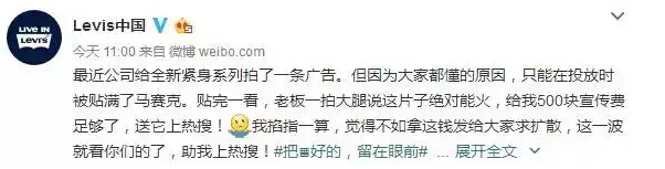 穿上牛仔裤时被打的“马赛克”。 这些打了马赛克画面不禁让人浮想联翩,连狂人都控制不住自己,连续看了3遍。看第二遍是荷尔蒙在作祟,而第三遍是真的有被它触动到。现在的网络环境有很多限制,而对于我们这种喜欢上网的年轻人来说,明明只想翻墙看个剧,可是连VPN都没了;明明只想看个自己喜欢的公众号,可它却被封了;打开收藏夹里的网站,不是变成了404重庆网络营销就是被和谐了。而这支打满马赛克的广告,恰好刺中了这个痛点,传递了即便在网络环境限制的情况下,Levi's®也是鼓励年轻人真实的表达自我。不仅仅是屏蔽和修正不好的身形,而是发挥马赛克的功能,修正敏感的字眼,把美好的一面,都留在眼前,让中国年轻人用自己的方式,表达最真实的一面。用Levi's®官方的话来讲,打码的目的就是为了弘扬真!善!美! 似乎是铁了心的要将马赛克style进行到底,除了广告片之外,Levi's®还做了一系列营销推广活动。