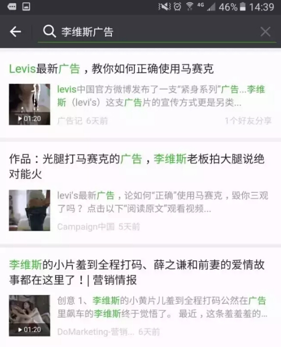 我们再来看看微信平台上,狂人搜了下“李维斯广告”关键词,出现的几乎都是广告类KOL大号的自行转发,毕竟现在自媒体当道,好的作品,有创意的作品都是自带流量的。