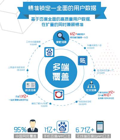 精准锁定——全面的用户数据 百度拥有万亿级的量本数据、千亿级的数据积累,在人工智能与计算、大数据分析方面一直主打头阵。在此基础上,百度大脑可对用户进行人群属性、搜索意图、行为数据、兴趣爱好四重定向。 目前,百度覆盖中国95%的网民,拥有6亿+的搜索用户,无线端月活6.7亿+。在学校用百度作业,在公司用百度指数,不懂就问百度搜索……百度可谓触及生活工作的方方面面。