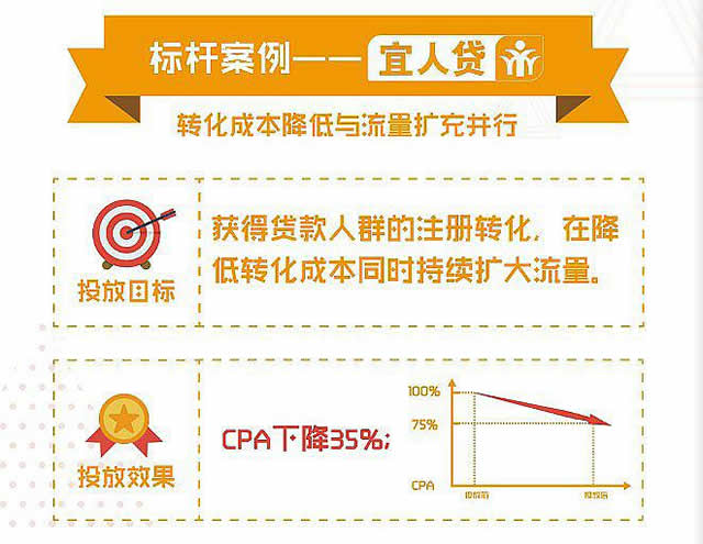 众里寻“TA”无觅处,百度寻人省功夫 除了营销效果,营销成本也是广告主们关心的关键问题。现在的广告再也不用被当作浪费,不仅能扩大用户量,还能有效降低ACP和转化成本,“少花钱,多赚钱”这么好的事哪里找?当然是百度Lookalike定向啦。 以“宜人贷”为例,为获得更多贷款人群的注册转化,并在转化成本降低的情况下扩大流量。 “宜人贷”与百度信息流广告合作,通过百度“寻Ta”工具,拓展相似人群,并进行针对性广告推广,最终实现CPA下降35%,Lookalike消费最高占整体账户投放的50%的成绩。