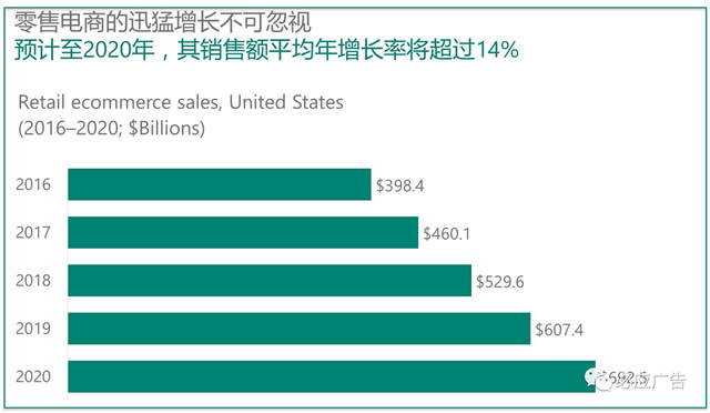 eMarketer 数据显示,2016 年,全美零售电商销售额高达 3984 亿美元,这个数字在 2017 年将增长至 4601 亿;预计直至 2020 年,电商销售额都会保持住 14% 以上的年平均增长率。钱买不来快乐?或许吧,消费主义当道的今天,这样的老生常谈可丝毫没能影响到美国人买买买的势头。