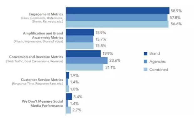 ▲社交媒体营销预算 对营销者来说,在做每一个市场决定之前,整合社交媒体资源变得越来越重要;而且社交媒体预算将呈现持续增长的趋势。据2017CMO调查研究报告指出:营销预算将占企业总预算的12%,而社交媒体营销的预算则占企业整个营销预算的10%,而且在未来五年内,还有望增长到18.5%。尤其是社交媒体营销&内容营销,预算将有望达到企业营销预算的55%&56%。 (2). 衡量社交媒体营销成功的基础指标依旧是转化和ROI