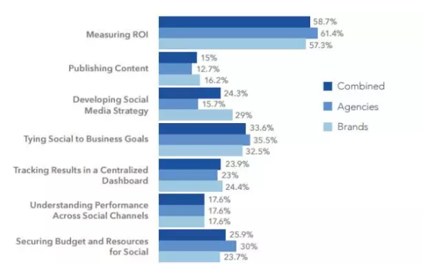 ▲衡量指标 有21.1%的受访者表示转化和收益是最基本的指标,有15.8%的受访者表示扩大品牌声誉是最常用的指标。 (3). 2017年社交营销人员面临的挑战