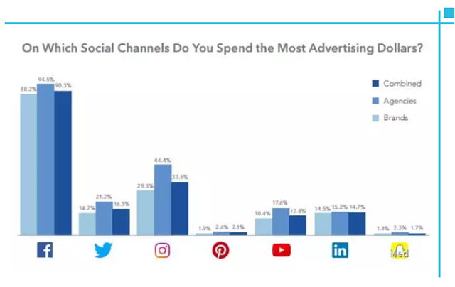 ▲营销人聚焦的重点 今年的社交媒体营销重点还将聚焦于优质内容,其次是营销目标要与社交营销策略保持一致。 2. 行业前沿洞察 >>>> (1)付费媒体在社交营销中迅猛增长 据最新调查研究显示:2017年第一季度,Facebook, Instagram, Twitter, LinkedIn, Snapchat, and Pinterest在付费媒体上的花费增长了61.5%。数据表明:付费媒体在社交营销策略中扮演着重要角色。 >>>> (2)FB仍然是广告支出最多的平台 据eMarketer数据显示: 在2017年,全球在社交媒体的广告支出将增长26.3%,仍有90.3%的营销人员在Facebook上的广告支出最多。