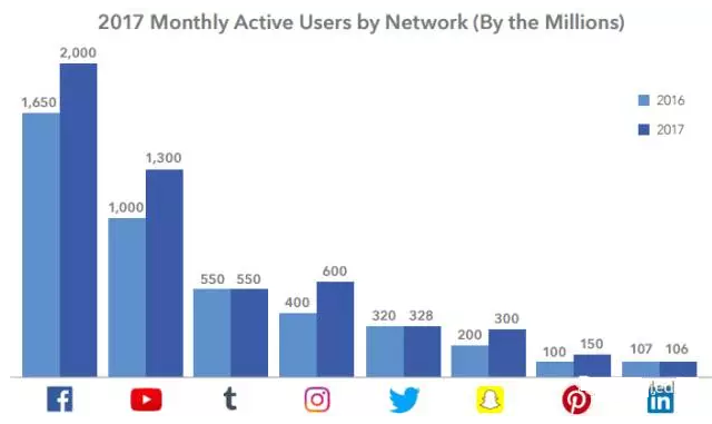 2017年MAU最高的社交平台依旧是Facebook,YouTube位居第二。