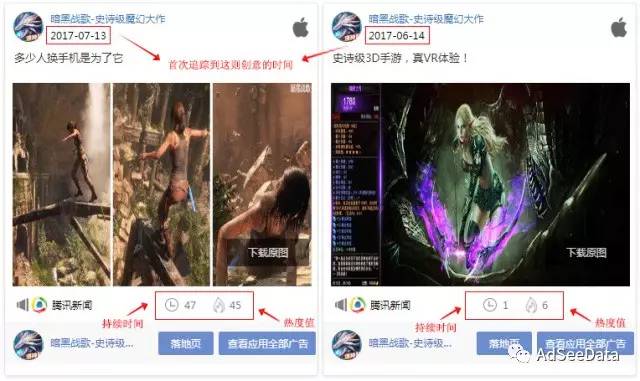 有两个衡量指标:投放持续时间、热度值。 1、持续时间:是这则广告创意的投放周期,最小计数单位为天。 2、热度值:是指这则广告创意的投放力度,也可以理解为这则广告的曝光力度值。 如何通过这两个指标评估一则广告创意的效果呢?我们需要综合评估。以下分析一款游戏在腾讯新闻平台上两个创意,通过上述两个指标来判断创意的效果。