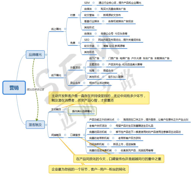 营销和销售的最本质区别是:一个是客户说产品好产生购买意向,一个是销售说产品好产生购买意向!!对于营销,需要做到的两点分别是“品牌曝光”与“潜客触及”。&SEO赚钱ldquo;品牌曝光”可以在用户的心智中打下品牌印记,当客户在产生需求时,直接发生转化,这个也就是我们常说的“广告效果的延迟性”;“潜客触及”是目前90%以上的企业都在做也一直坚持在做的一件事,我个人认为,品牌触及可以分为由企业主导的“直接触及”的销售过程,由客户主导的“间接触及”的口碑宣传过程,很多公司往往忽略了间接触及这一块内容,只是在不断的发展新客。
