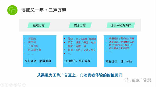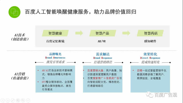医药行业的“渠道万碎、媒介万碎、价值体验万碎”时代下,刘虎提出需要一条智慧链条,把散落的珍珠重拾塑造。而百度人工智能营销通过激发健康价值,传播用户体验,交付终端管理三个方面的营销体系,是可以把碎片的现状有机串联起来。