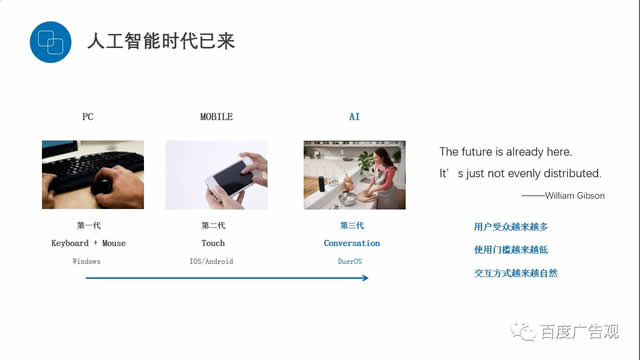 同时人工智能时代已经悄然的来临,什么是AI时代呢,第一个时代是PC时代,我们的输入设备是键盘鼠标,输出的设备是屏幕和音响。第二个时代,就是今天我们拿的手机,最主要的交互是手指的滑动。未来AI时代,大家交互的体系可能是对话式,所有的设备都能够识语音来进行交互,设备可以听懂你的话,给你反馈信息。所有科技的发展一定是降低人们使用的门槛,一定是要解脱人的双手和双脚。百度人的使命也由“让人们最平等快捷地获取信息”提升到“用科技让复杂的世界更简单”,其实这个新的使命是包括了老的使命,百度可以做更多事且做得更好,用科技赋能医药行业,才刚刚起步,百度愿意携手医药品牌一起,推动产业创新升级。