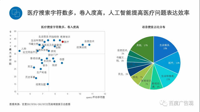 例如大家在搜索医疗方面需求的时候,搜索的字符特别多,需要9、10个甚至更多字符,这也说明医疗的需求比较复杂,不是一两句话可以说清楚的问题。百度今天也在普及语音搜索,而且越来越多的人也愿意用语音去搜索,而语音搜索里使用最高频率的其中就包括了医疗的需求,这是未来人工智能要去解决的事情。
