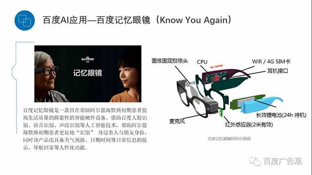 据国际权威医学杂志《柳叶刀》数据显示,目前中国约有900万人患有阿尔茨海默病,占全球总患者的1/4。若按家庭规模是祖孙三代五口人来计算,那么就意味着中国有近4500万人正在直接或间接地忍受着阿尔茨海默病所带来的痛苦和折磨。因此百度针对阿斯海默症患者开发的AI眼镜,运网络营销有哪些途径用人脸识别技术,采用深度神经网络对画面中出现的人脸做检测和识别,帮助患者记起身边的亲人和朋友。目前,阿斯海默症还没有有效根冶,但是通过百度的这项技术可以有效改善病人的生活质量,同时减轻病人家属的苦恼。 在这个案例中,百度采用了高度优化的并行训练算法,以及新的策略对数据做区分和通信,同时还采用了更大的深度学习模型和增强方式。另外,还通过海量的语音数据以及非常深的卷积神经网络,机器自动挖掘说话人中特征的表示差异。这些技术未来也将用于营销,帮助广告主深入的了解消费者,总结特征差异,创造更多的价值。