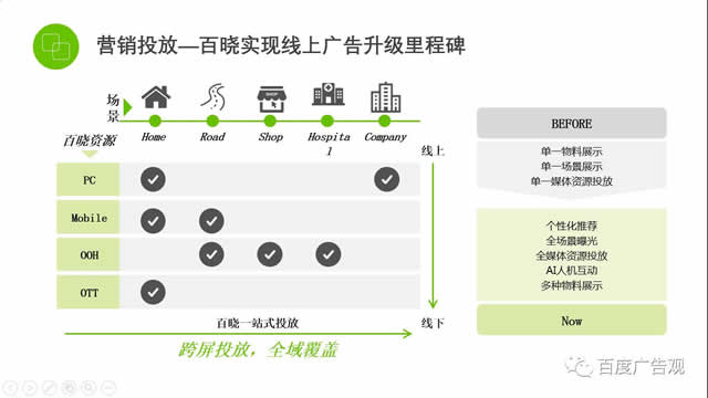 当通过手机把这部分人群识别营销的出来后,我们去进行回溯,发现在患者到店前一周的时间,是反映所有病症的高峰期,那它有什么作用的呢?很多时候,我们不知道广告打完了,消费者有没有对品牌有一个认知,不知道消费者需要什么,不知道消费者有没有到门店,不知道哪些人到了门店发生了什么,不知道当收集完患者到门店的行为后,还能够干什么事。我们是要把这部分人群线上和线下的行为进行打通,这就是一个用户识别的过程。 今天大家都在讲媒体碎片化,而媒体也都是碎片的,但人不是,只要去锁定一整套人的时候,所有的媒体围绕人去运转,把人识别精准的时候。所有的媒体碎片就像相当于有了一个链条来串联起来。在这个概念下,百度也在打造线上、线下整个媒体的布局,背后通过百度的知识图谱、大数据和百度对医患需求的识别,来为营销赋能,我们要设计整个营销投放过程中的流程。