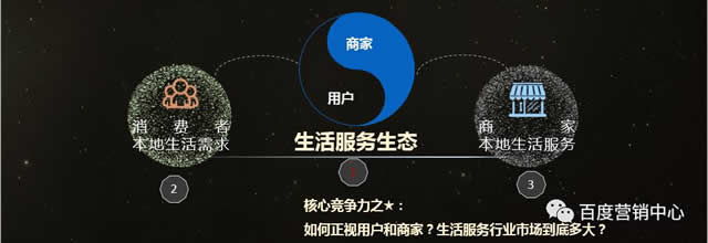 生活服务生态:在我们整个生态当中的每一个节点上面都会面临着两个非常关键的问题(用户+商家),一个从供给方,一个是需求方,来对接服务类商品的供求市场。 企业大数据精准营销