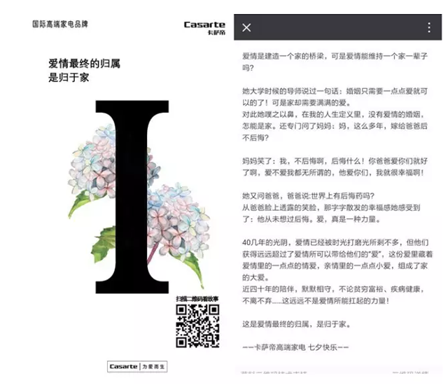 从预热到引爆再到收尾,卡萨帝完美掌控节奏,先慢节奏预热话题,激起兴趣,之后节奏加快,用极具冲击力立体化创意长图引爆话题,最后再慢下来,用情怀引发用户共鸣。一环扣一环,形成了一个完美的推广系统。 精准洞察品牌与热点结合点 借势七夕情人节,用“污”诠释爱以赚取快销时代的大众眼球,前提要品牌调性、人群受众一致。不考虑品牌形象和定位,盲目为“污”而“污”反而适得其反,给品牌形象带来毁灭性的打击。 城市高端精英人群是卡萨帝的重点目标对象,传递为爱而生,为爱进取的卡萨帝,情人节自然与其品牌关联度极高。此番卡萨帝深刻洞察其目标用户渴望高品质的生活方式,追求内在丰富和极致格调生活的特点,挖掘七夕爱和家的特质,将品牌调性与节日爱和家的高端内涵紧密结合。 不管是什么朝代,人们都在追寻高端优质的生活方式。长图中牛郎带着织女去体验不同朝代人们的生活,不惜穿越几个世纪,最后只为了给织女一个最完美的家和生活。将品牌为爱不妥协和打造宣传片拍摄手法极致生活理念展现的淋漓尽致,丝毫没有违和感。品牌调性与节日热点珠联璧合,引发用户共鸣,用户进入品牌营造的不同朝代生活场景中,带入感极强,将品牌高端形象打入消费者内心,大大增强品牌与用户之间的粘性。 卡萨帝用爱、生活和家,给七夕情人节带来了一股淡淡深情的暖流。 用短故事打动目标用户 移动阅读时代是长文章的坏时代,人们追求碎片化阅读,读者很难用大块时间去阅读一篇长文章,走马观花式往往成为大部分人的阅读常态。腾讯发起的一项关于移动端阅读习惯的调查中显示故事性强且对专业要求不高门槛更低的文章易覆盖更广的用户。同时内容的话题选择和情节的丰富度是关键。 卡萨帝将六个有关爱情的暖心短故事分别放入六张海报的二维码中,组成“I LOVE U”系列海报,内容选择与热点紧密相关的短篇爱情故事,不一样的海报藏着不同的故事情节,吸引了大批读者点进去阅读,用带有情怀的短故事引起读者共鸣。