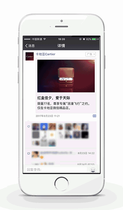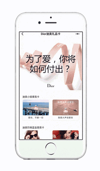 (迪奥七夕朋友圈广告) 其次是玩法。作为一度最热的营销创意承载工具之一,H5为广告创意的发挥提供了巨大空间,但随着小程序的到来,广告主在微信投放广告时,营销与创意的承载工具多了小程序这一选项。同样是七夕营销的商家必争之地,奢侈品牌卡地亚这次也在朋友圈豪气了一把,给77位情侣包私人直升机撒狗粮,外层的视频卡片广告看上去大气十足,但是却没有多少新意,跳转H5后是卡地亚的微信商城,先不说内层的页面设计和加载速度慢的问题,这个套路去年迪奥已经在七夕限定版戴妃包的朋友圈广告中玩过,今年人家已经开始玩小程序。男票们进入“Dior迪奥礼品卡”小程序后,可以不再头疼该买什么味道的香水,买什么颜色的口红,买张礼品卡像送微信红包一样送给她,全部搞定!