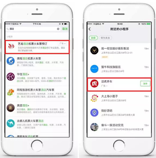 小程序广告试点 朋友圈入口将来临 H5的兴起带动了很多技术型广告营销公司的发展,小程序也许也会。小程序无需加载、用完即走的使用特性让其拥有可以媲美原生APP的使用体验,而这一体验也让小程序与微信广告的结合水到渠成。 事实上,继6月16日小程序搜索关键词广告之后,6月底,小程序又灰度测试了附近的小程序广告,广告位已经开始灰度测试。此次灰度测试附近小程序广告采用的是广告轮播形式,在每次打开或者刷新时都会在固定位置出现广告。与小程序搜索关键词广告相对比,附近小程序的广告展现形式会比较主动的,会根据不同的用户推送不同的附近小程序广告,其原理与朋友圈广告是相类似的。从开放搜索广告功能在到附近小程序广告,可以看出腾讯已经做好了切入广告市场的准备了,微信的野心已经很明显——抢占移动互联网时代的广告业务。