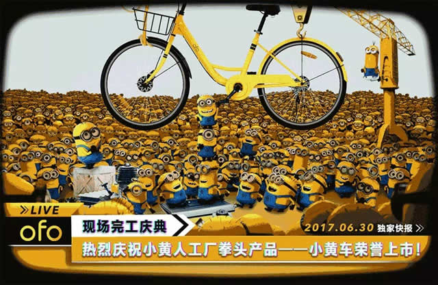 近日,在一些城市的街头,你一定能够见到这样的ofo小黄车——两个轮毂上配上了小黄人形象,车把前也有一双萌动而撩人的大眼睛,如同赋予了小黄车鲜活的生命。这样的ofo大眼车一定会让你驻足观望,并抢先一步骑走再说。原来,ofo小黄车正式联姻国际电影巨头环球影业,获得环球影业旗下著名品牌IP小黄人的形象授权,“黄在一起”了呀。