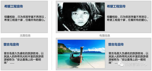通过直观对比,可以明显感觉到以上右侧带图内容的吸引力更强,我们也更愿意定睛观看,也更有欲望去点击了解详情。 对于一般的信息资讯,有配图和无配图的关注度差距如此之大,那么,在搜索广告中,带图的广告是否也具备同样的高关注度呢?