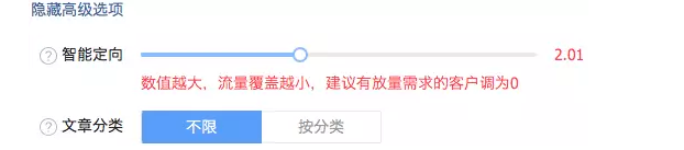 用户首次激活时间(新用户安装头条后首次打开应用的时间) 这个也是今年下半年才出的,可以选择选择1-3月、3月+试试。 APP行为定向 APP行为定向分为按分类和按APP两种,一般只选择按分类,按APP就不要选择了,因为量推送会很少。而且有些App量太少,你根本定向不到.... 是否过滤已安装客户&最低安卓版本 是否过滤主要看APP覆盖量和推广策略了,没什么可说的。最低安卓版本这个必须要填,不然推送给那些无法使用的用户就是浪费钱,选择高版本的安卓系统也可以一定程度上筛选出部分消费水平高的手机用户(因为新出的手机都是使用最新的系统) 手机品牌 手机品牌主要是过滤消费层次不同的用户,这个根据投放的APP情况而定。 网络 网络分为WIFI、2G、3G、4G 4种,我个人投放2g和3g肯定是不选的,因为网速慢。投放Android时纯WIFI定向比勾选4G定向的成本要低15%左右,IOS要低25%。今日头条WIFI环境的使用率大概为80%。 智能定向 智能定向建议一般APP 2-2.5,游戏类1-1.2,定向值越高,消耗越慢,量越优质。