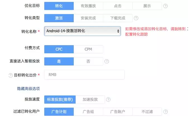 优化目标分为转化、有效播放、点击、展示4中,转化又分为激活、安装完成、下载完成3种,做应用下载个人建议使用点击和转化。由于点击起量快,前期使用点击测试素材会很迅速,而且少去了转化第一阶段的高成本,拿出几条素材CPC测试完后,保留好的素材跑按激活转化或者按安装完成转化和下载完成转化,这样会明显降低你的投放成本。不然你的素材不合格,怎么跑OCPC(按转化出价)都测不出来很好的效果,直接使用未测试过后的素材跑OCPC无疑是浪费老板的钱,对老板的不负责任。注意:OCPC按激活转化需要配置链接,这个不懂计算机的同学需要咨询代理和开发,使用链接需要测试联调调通后才可以使用。(突然发现大学学了计算机还是挺有好处的....) 投放速度&过滤已转化用户 投放速度选择标注投放,加速投放其实也没试出来有多大意义。过滤已转化用户也是最近才出的,看投放的APP情况而定,个人觉得大多数APP可以选择不过滤。 创意素材 小图大图组图的点击率各不一样,组图的效果和头条原生新闻信息流最为相似,点击率也最高。文案强烈建议使用兴趣词包,能够提高点击率,提高曝光。亲测:使用兴趣词包,点击率提高了0.3-0.4%,有些APP使用后或许能提升更高。在右边有个预览广告位,默认是信息流、详情页、段子都勾上了,建议去除段子信息流,内涵段子的用户付费率普遍比较低,用户质量一般,很多APP逼格稍微高点的都不适合投放内涵段子。出去后点击率可以明显上升,用户的ROI也会得到明显的提升。 应用下载详情页 这个地方我一般使用头条的自建站,自己使用头条的应用下载模板,这样可以统计到头条的下载完成数,安装完成数、下载开始率等详细的数据,使用自己的域名投放APP下载是统计不到详细的数据的。自建站里面的APP下载链接一定要跟起初设置的下载链接保持一致!不然你的投放效果会很惨,一时间不赶紧改回来这个计划基本就废了。 应用名 应用名这个不同的计划最好要填写不一样的名称,比如“迅雷”这个APP,你投放的时候填写为“迅雷-下载超快”“迅雷-看片神器”“迅雷-极速下载”。因为头条会根据这个应用名给你分配曝光,不同的用户一天内只能看见同一个应用名的广告5次。也就是说头条会根据应用名将你识别为多个APP,给予多次曝光,从而提高你的消耗。 副标题 副标题是用来提高转化点击率的,可以加一些修饰性的词语,比如“下载爱好者专属”“5000万人都在用”,副标题的数字不要写成中文,5000不要写成五千,不显眼! 广告评论(选择关闭) 创意分类&创意标签 这个地方影响预估点击率,因为ECPM=预估点击率*预估转化率*目标转化出价,你的预估点击率越准确,你的素材如果实际点击率越高,你的曝光就会越多,成本就会越低。投什么就选择什么类型,不要选错了。 第三方监控链接 这个检测头条和代理干不干坏事儿的,可以头条是按CPC和CPM计费的,到时候核对具体数据如果有明显异常可以跟他们撕逼退款补消耗的,不过目前来说检测和点击基本上不会存在较大误差以至于撕逼。存在即合理,CP们还是在第三方检测后台生成一个链接吧,OCPC按激活转化也是需要生成这个链接的。