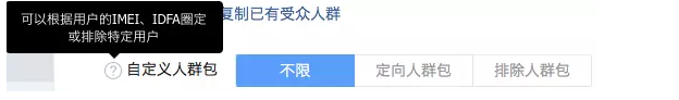 自定义人群包的用途是根据用户的IMEI、IDFA(手机特有识别码)圈定或者排除特定用户,比如京东做电脑大促,可以根据有过购买主板、显卡、电脑整机的用户设备IMEI/IDFA进行精准投放,以便于优化投放,达到刺激用户再次购买,提高订单量的效果。 地域定向