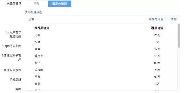 地域定向之前分为不限、省市两种,最近仿造腾讯广点通添加了区县和商圈定向。后面两个我还没尝试过,不过前两个的用途很大,主要是在成本有限的情况下,分析受众人群,剔除掉注册激活成本高,付费率低的省市,尽可能降低成本,获取数量更多质量更优质的用户。 性别 性别定向,我个人建议是能不选就不选,如果非产品特性要求,选择不限,因为头条的性别区分虽然精准,但存在大部分性别未识别出来的用户,选取之后会极大影响你的曝光和放量,这些性别未知的用户是收不到你的推送广告的。 兴趣分类 兴趣分类的选取视APP的情况而定,如果范围比较广的APP可以选择,垂直类APP的投放建议兴趣分类选择不限,只添加兴趣关键词(e)即可,因为它和兴趣关键词是取交集的,垂直类APP勾选后不选关键词量会非常不精准,两者都选取很有可能会导致量及其精准但是曝光非常少,无法大量投放的情况。 兴趣关键词 兴趣关键词越多越好,对任何品类的APP,尽量选择竞品词,功能词,行为词,用户喜欢搜什么你就加什么。关键词的选取,主要有三种工具:1)头条推荐关键词&头条指数:今年头条后台升级,关键词优化做的非常好。填写关键词还有对应的相近词和其覆盖量显示出来,推荐的关键词都非常精准,也非常符合用户要求。2)ASO100、ASO114、应用雷达去看竞品的关键词,学习他们做了哪些词的ASO优化,我们也将这些词填上去。3)百度指数:选取一些搜索频率高,精准匹配的关键词。