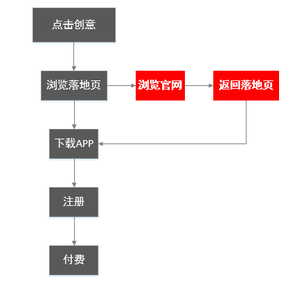 但是,优化师在分析了用户浏览路径后发现,用户到达官网之后,就再也没回到落地页上来。 为了排除其他因素的干扰,优化师甚至还通过控制变量的大样本随机抽样来进行AB测试,结果和他最开始时担心的一样:多了一个按钮后,转化成本比原先只有一个“立即下载”按钮时高了一倍! 为什么多了个按钮转化会差那么多? 为什么转化会差? 因为这个按钮把用户引导到了转化漏斗之外。 一起来看图: