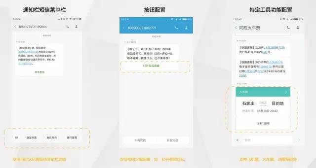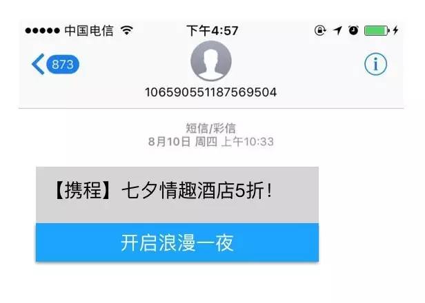 只要不是对App厌恶透顶,只是觉得不太常用、占内存,用户是有较大可能保留直达服务的。 这简直救了低频App一命。 比如携程,我每次买机票才会下载,用完就删。但下次我买机票的时候我嫌麻烦,或者没wifi,我也许找其他App解决了。同时卸载期间,携程做了任何活动也没法push通知我。 如果用户凶残到连直达服务都不保留呢? 别担心,我们还有定制短信。短信样式,按钮文字,短信界面底部的按钮,都可以定制。