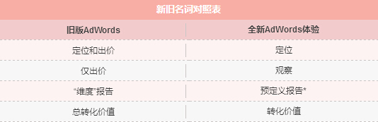 除此之外,全新AdWords体验中的一些功能名称也发生了变化,以下是一份对照表供您参考: