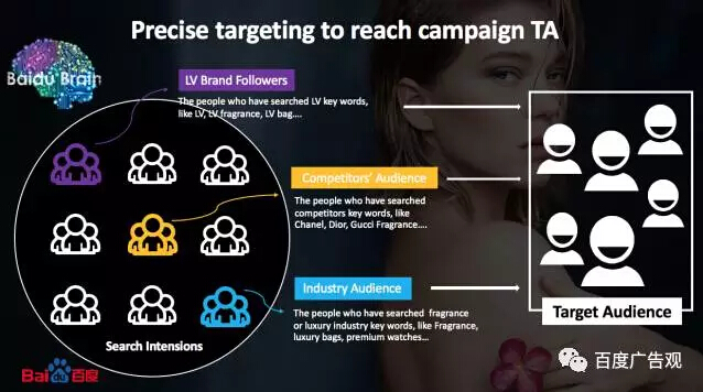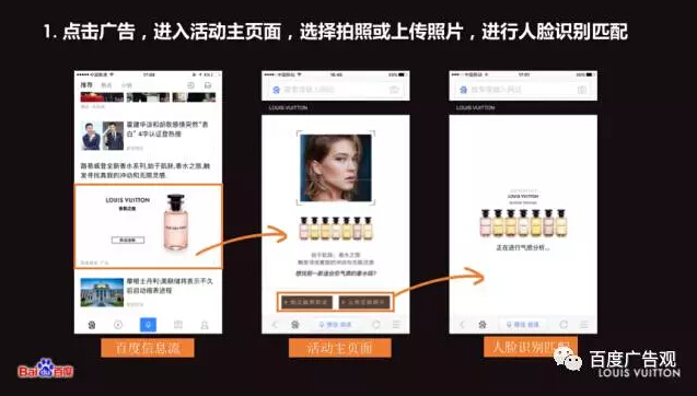 特点三:口碑效应带动小众香水 除了大牌香水外,近年来很多小众香水由于高颜值和明星代言在社交平台快速走红,social buzz已经渐渐成为一个传播项目是否成功的参考依据。 启示 方案需具有高度的可传播性,在社交平台引发关注和讨论,扩大传播影响力,保证项目热度持续。 基于以上分析和启示,我们来看看百度的解决方案吧! 推广策略及项目营销策划与实施过程概述 推广策略 通过百度大数据和资源平台,精准触达香水及奢侈品人群,并借力百度AI人脸识别技术如何做好软文的推广为用户选择匹配其个人气质的其中一款LV香水,最终帮助品牌建立新品知名度,并呈现LV香水系列时尚、神秘和充满科技感的品牌魅力,拉动线上销售。 推广平台 手机百度APP原生信息流 互动流程 第一步:找人(关键词锁定目标用户) 系统根据关键词进行用户匹配,找到曾经搜索过包括LV品牌关键词、竞品关键词和行业关键词的用户,将广告以信息流大图样式推送给他们。
