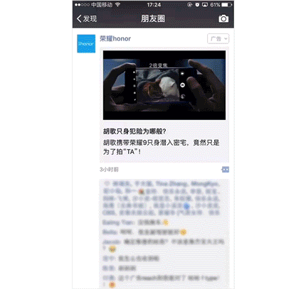 自定义原生推广页组件示意 当然,如果你对素材的制作还在摸索阶段,可以选择行业模板,快捷便利地生成广告。而对于有一定素材制作能力,且对创意有更多想法的广告主而言,不妨试试全新利器——自定义原生推广页,它将助你更好地实现营销目标。 接下来,我们用实例看看各个行业的品牌主如何玩转自定义原生推广页。 丰富素材灵活组合,自由拼接助品牌讲好故事 自定义原生推广页除了可自由拼接组件外,还升级了部分组件能力,如视频组件现已支持全屏播放,显著提升广告表现力。 荣耀9手机上市,邀请人气明星胡歌代言,用一部悬念短片传递产品强大的摄影功能。借助自定义原生推广页的视频组件,用户可以在落地页欣赏到完整版广告片,开始的悬疑氛围和结尾的可爱反转以及荣耀9手机都令人眼前一亮,搭配图片、外链等丰富组件自由拼接,不仅充分体现了荣耀9“美的有声有色”的品牌诉求,更直接引导用户跳转至购买页面,构成销售闭环。