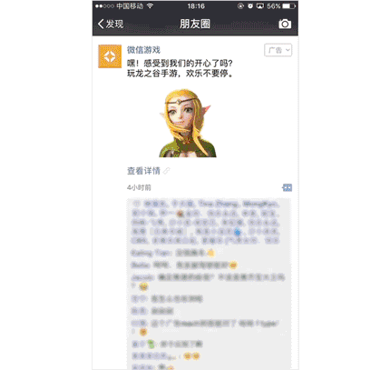 华为荣耀9朋友圈广告示意 动态表现力升级,视频组件提升游戏商家转化率 游戏的动画效果和玩法录屏是吸引用户下载的关键,为了更好地展现游戏的动态效果,《龙之谷》手游上线时采用自定义原生推广页,在落地页中加入了多个视频组件,60秒小视频生动地呈现了《龙之谷》精美的游戏画面和产品特色,激发用户一探究竟的兴趣。 与此同时,《龙之谷》利用自定义原生推广页的自由拼接组件能力,在落地页中设置了两个下载按钮,一头一尾,网罗住所有感兴趣的用户,让转化下载顺理成章。通过添加视频组件和双重下载入口,自定义原生推广页帮助《龙之谷》有效提升了下载转化率。最终效果上,龙之谷本轮投放收获了大批优质新用户,且人均下载成本仅为16元,远低于行业均值。